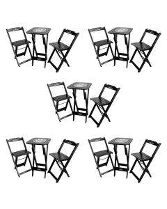 Conjunto bistrô dobrável em madeira, acompanhado de 4 cadeiras. Prático, elegante e fácil de guardar, é ideal para eventos, festas, áreas gourmet e ambientes compactos.